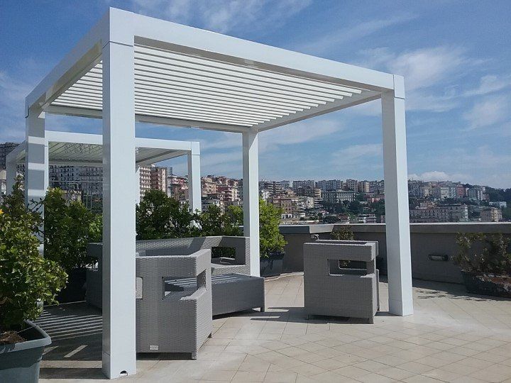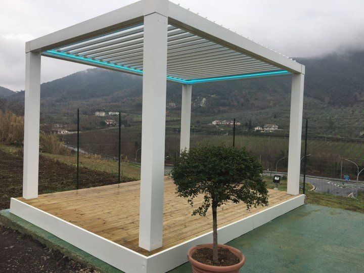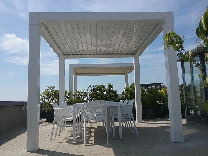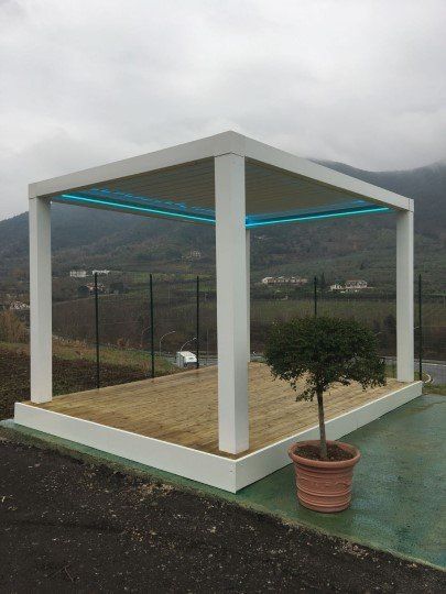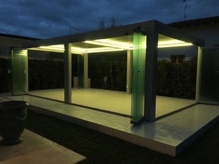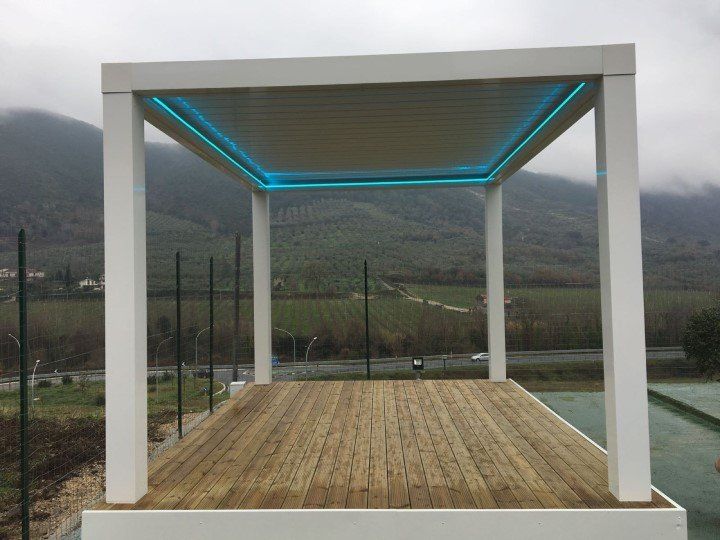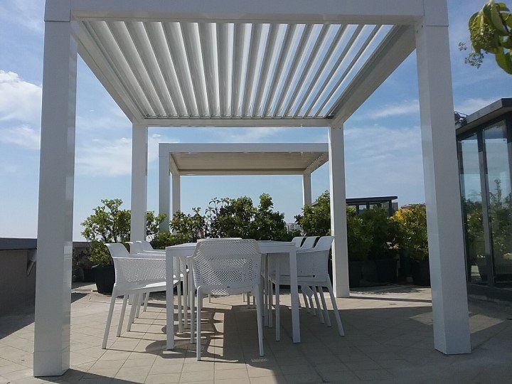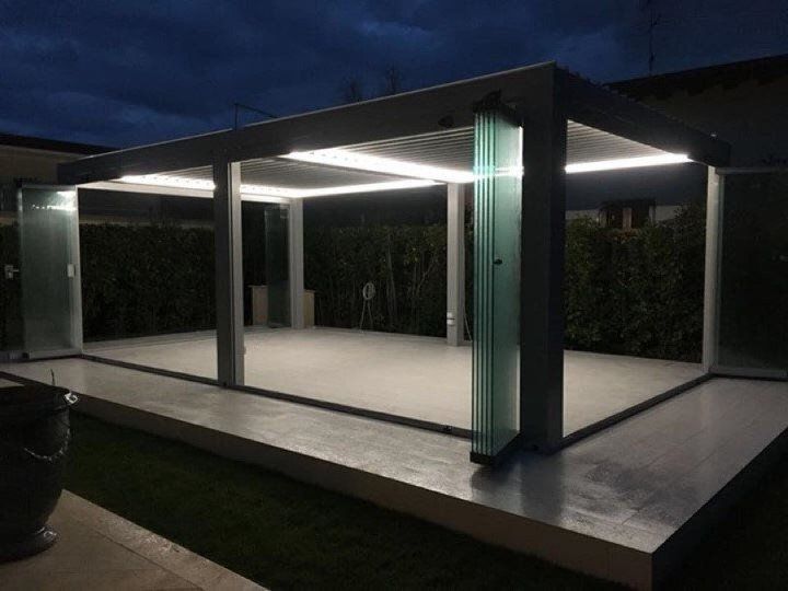 - Tettoia orientabile con lamelle in alluminio rotanti da 0° a 140°.